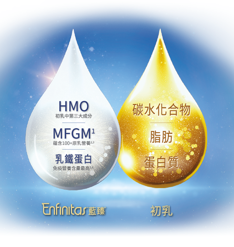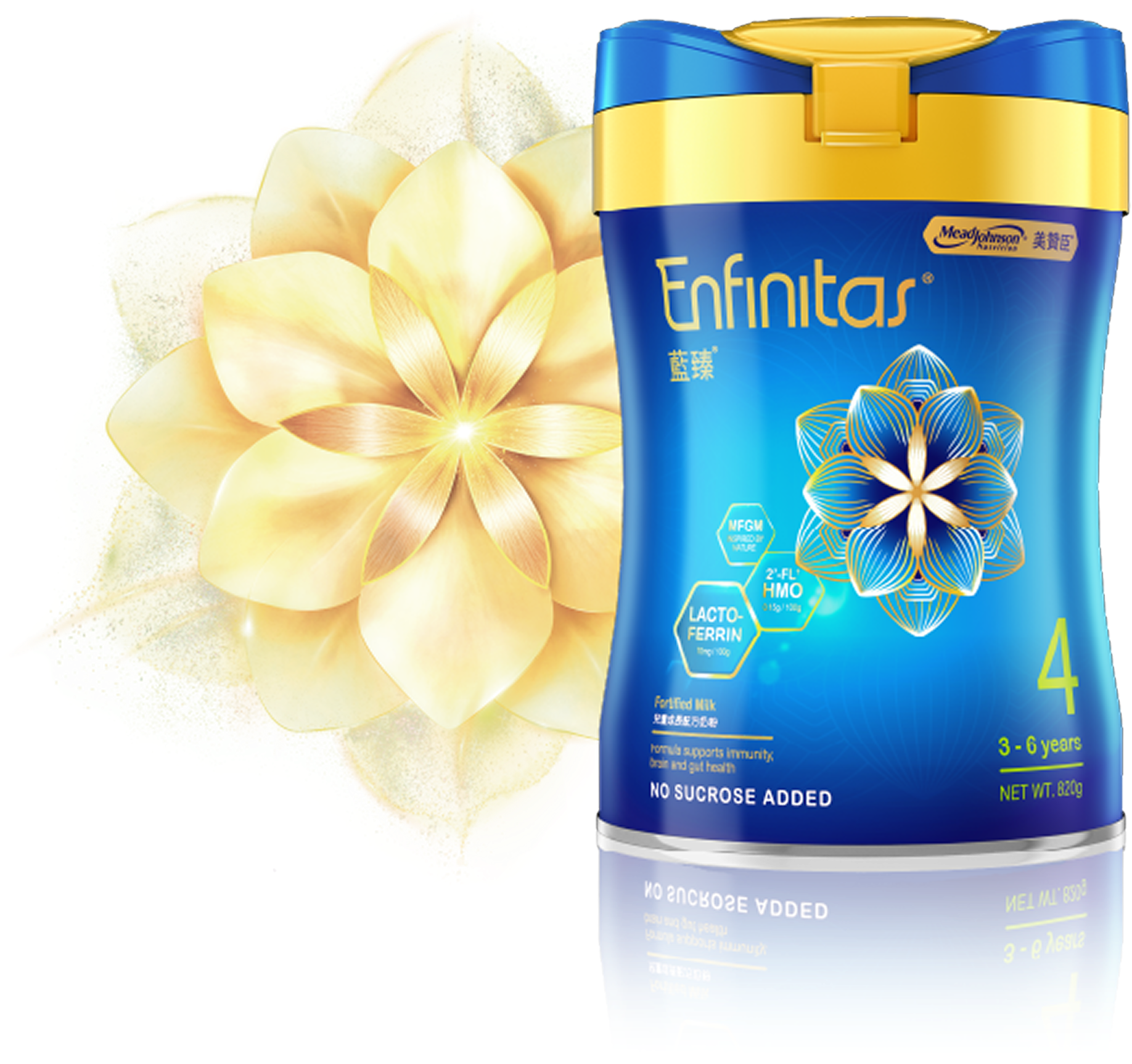 * LF COMPLEX+指同時於配方加入乳鐵蛋白、HMO、MFGM、DHA、PDX 和 GOS。根據美贊臣2023年6月調查,與香港主要品牌的兒童成長配方奶粉產品標籤比較,唯有Enfinitas 4號配方奶粉同時加入乳鐵蛋白、HMO、MFGM、DHA、PDX 和 GOS。